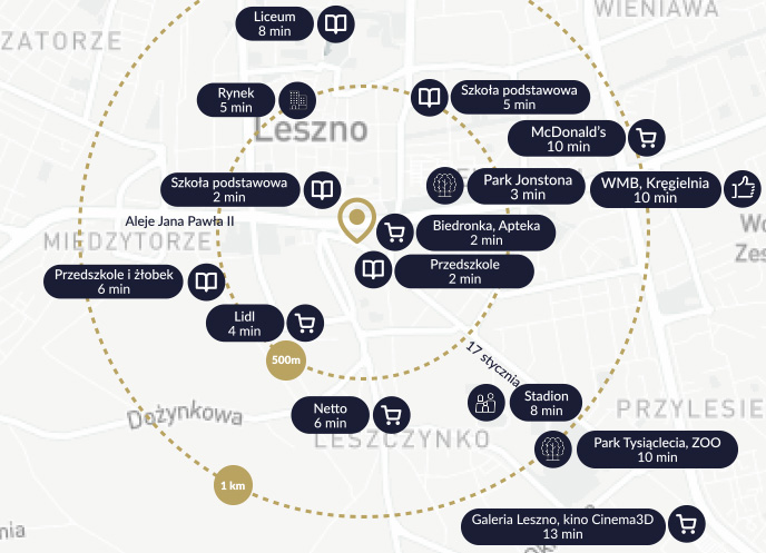 Apartamenty Centro to miejsce, w którym wygodnie można korzystać z pełnej infrastruktury miasta. Inwestycja znajduje się przy ul. 17 Stycznia 5 w Lesznie, w sąsiedztwie sklepów Komfort i Biedronka. Okolica znakomicie łączy odprężający klimat z pozytywną energią centrum miasta.