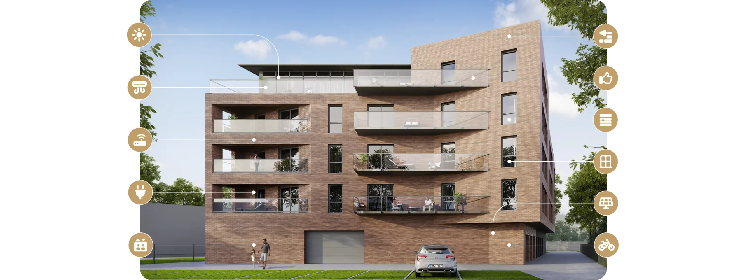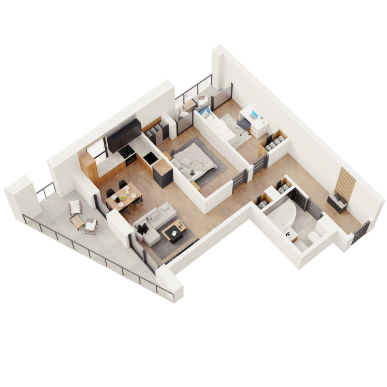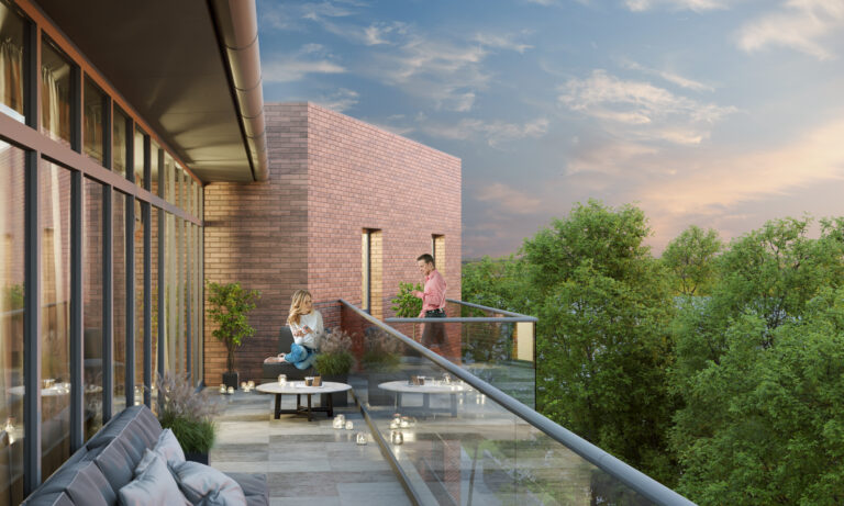 Apartamenty na ostatnim piętrze mają duże tarasy z pięknym widokiem na pobliski park i panoramę miasta, natomiast pozostałe mieszkania posiadają balkony lub loggie – wszystkie wykończone oraz z pięknymi szklanymi balustradami.